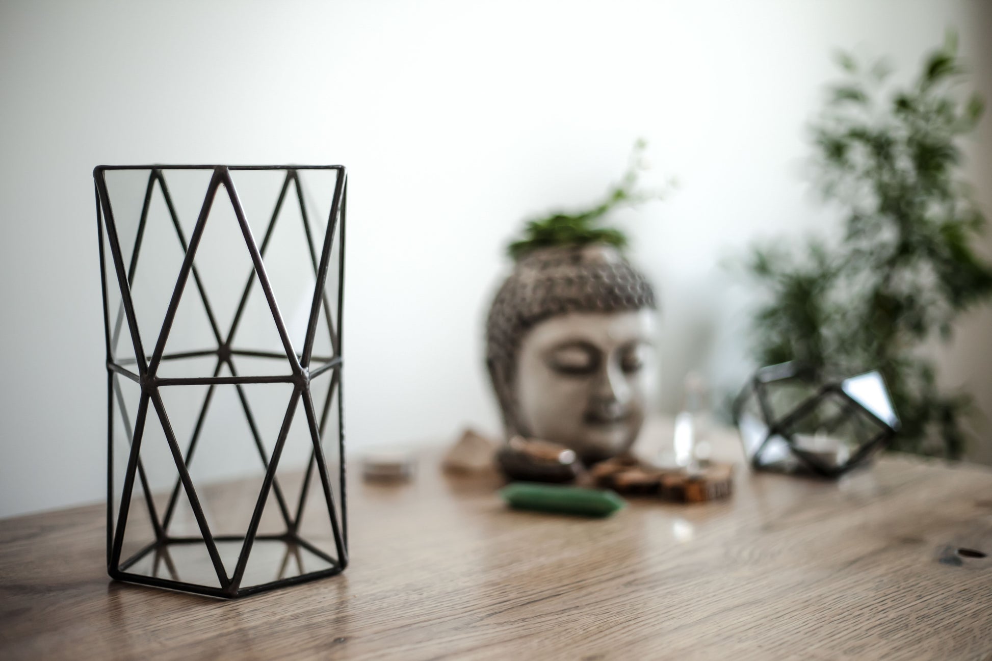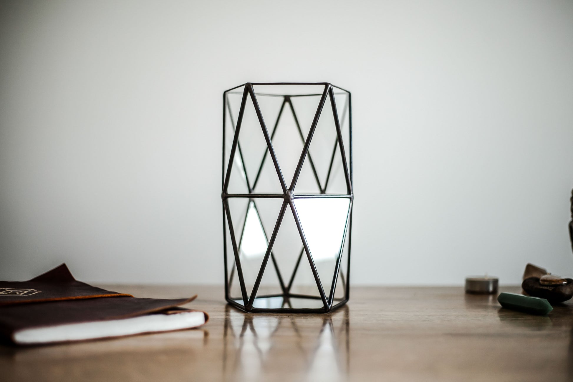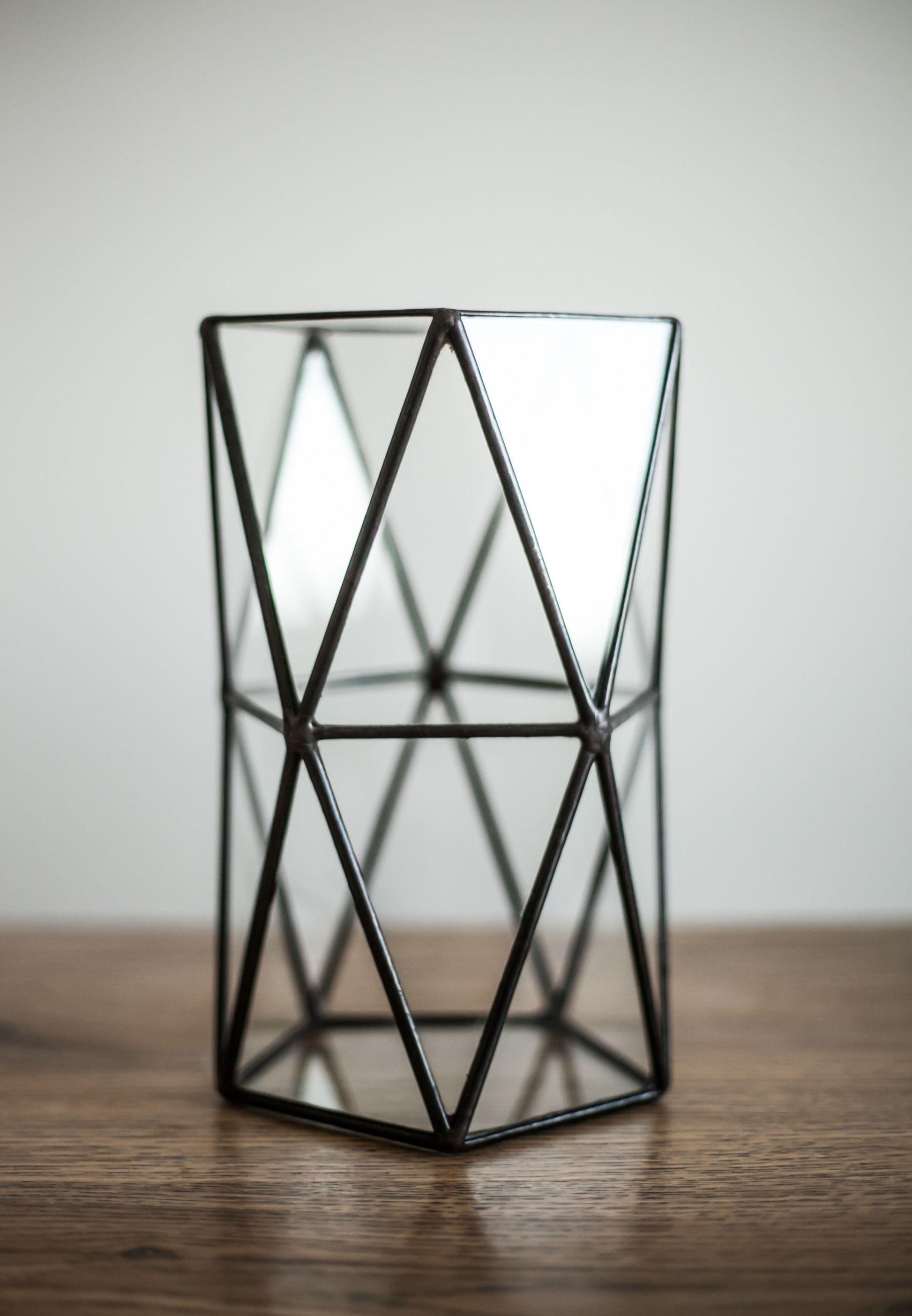 Stylish double anti prism shaped geometric glass vase.
