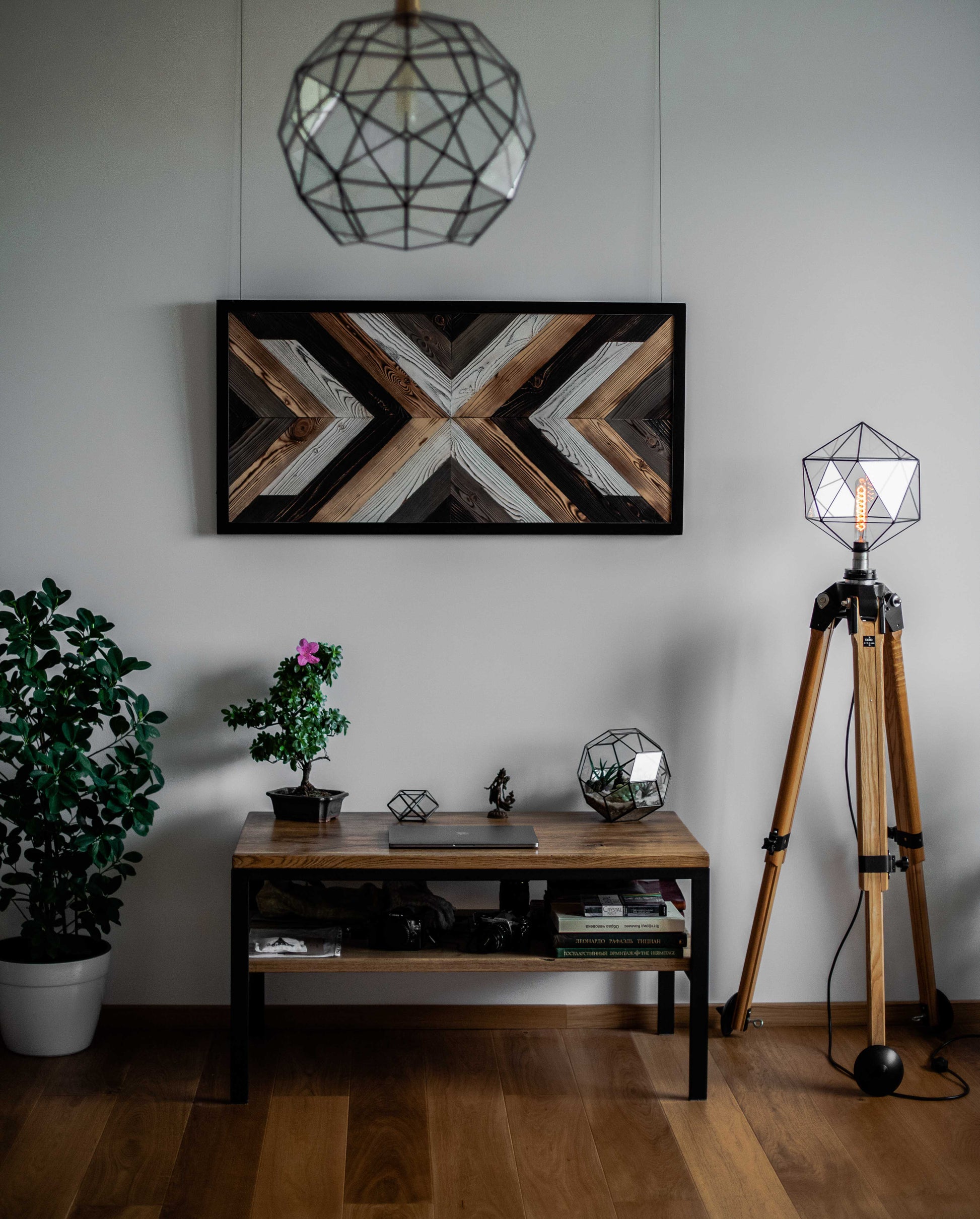 Industrial Wooden tripod with a aluminium mount fixture and geometric glass chandelier "Icosahedron" from the Stereometric Design.