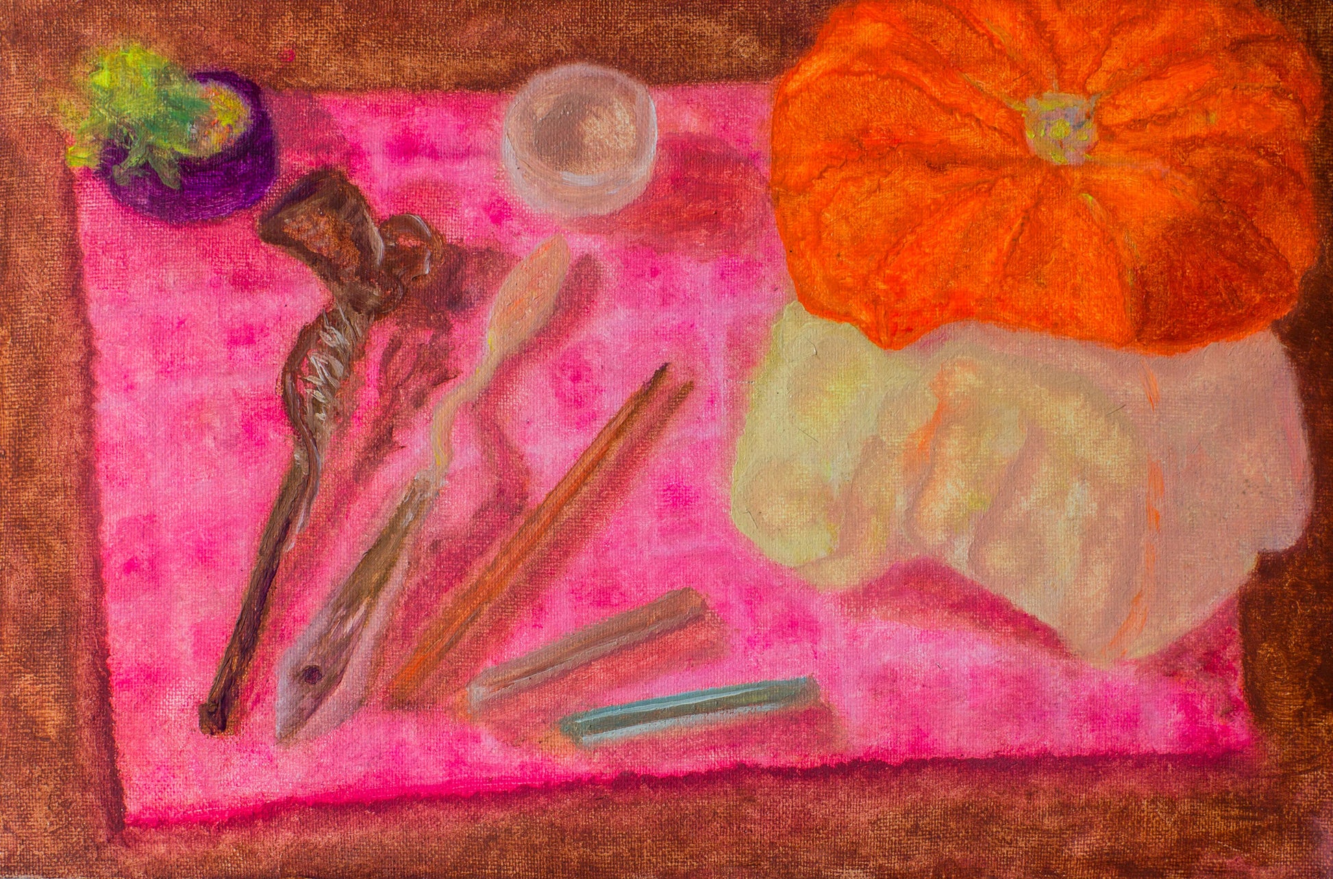 My first still life depicting squash, creative tools and a pipe with Hawaiian snow.