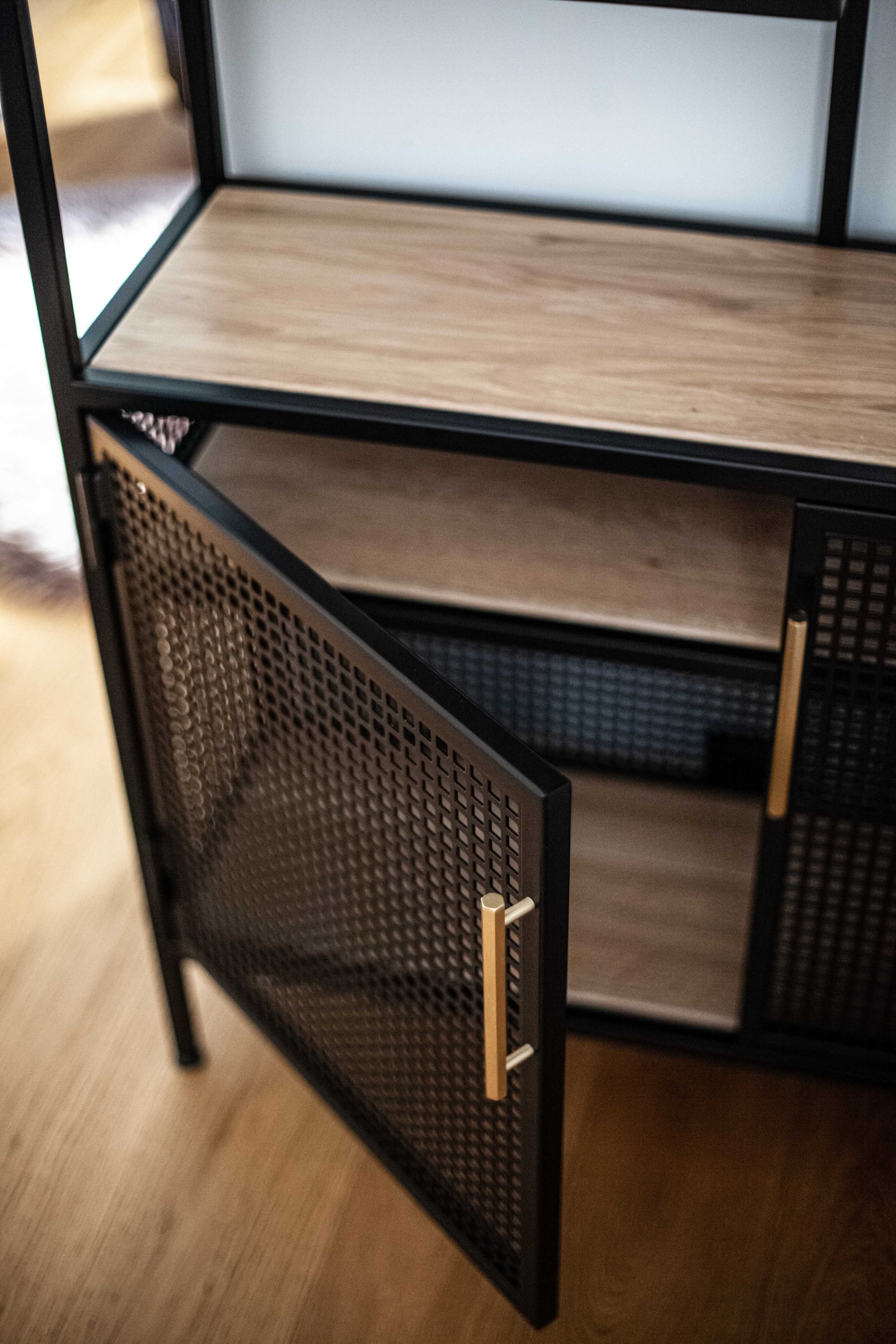 The furniture is made of metal profiles and perforated metal, the whole structure was processed by sandblasting, painted in black matt powder paint. Doors with hexagonal brass handles, doors fixed with magnets. The shelves are made of oak and professional oil with clarifier was used to protect it. Feet adjustable to create the perfect level.