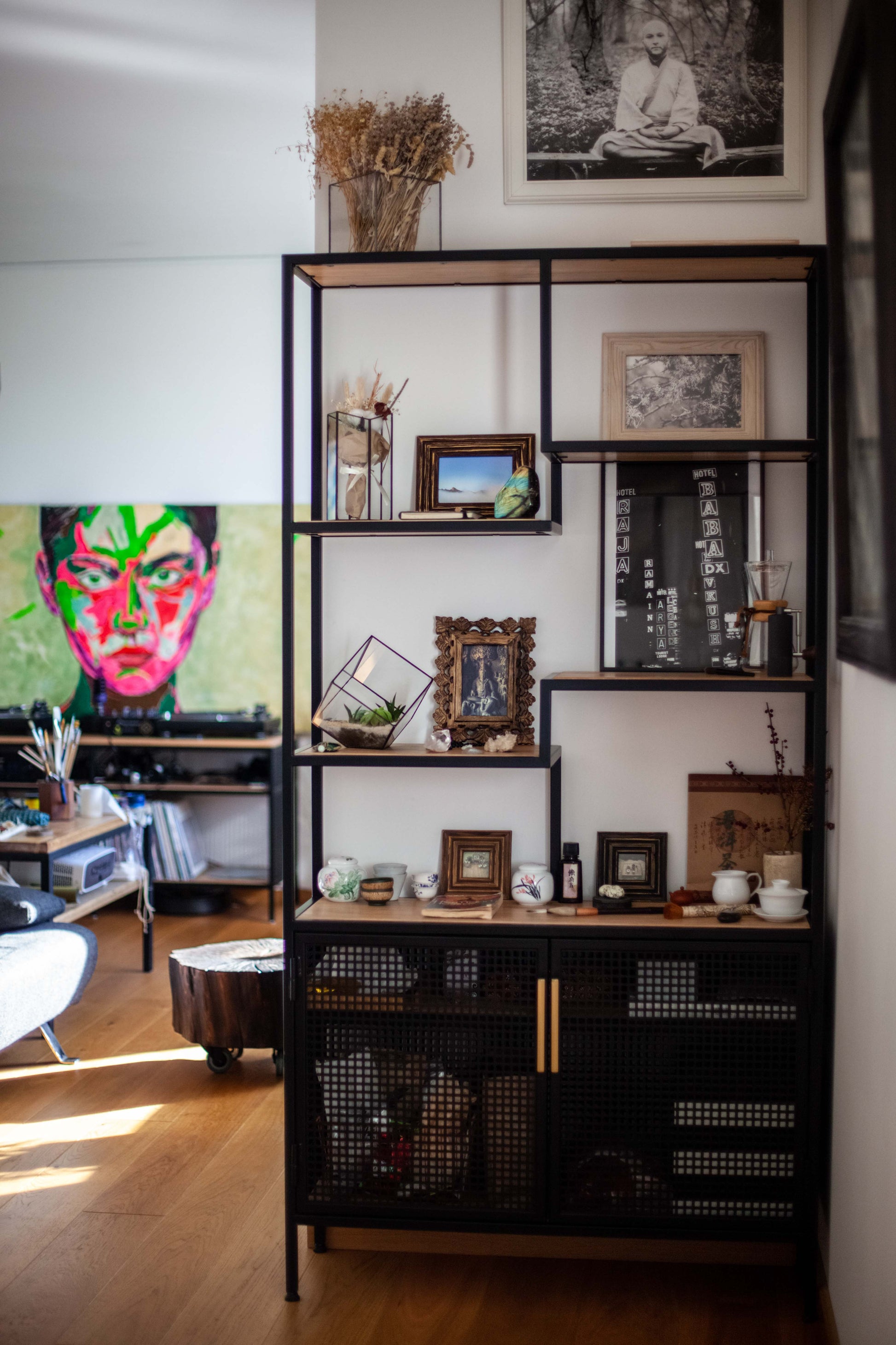 The shelving unit has 4 large shelves and 4 small ones and a blackout storage space made with perforated metal. You can easily arrange your favorite things and create beautiful compositions from them - be it books, photo equipment, tea utensils and your favorite other items of different sizes. The distance between the shelves is thought out so that you can arrange almost your favorite interior items harmoniously.