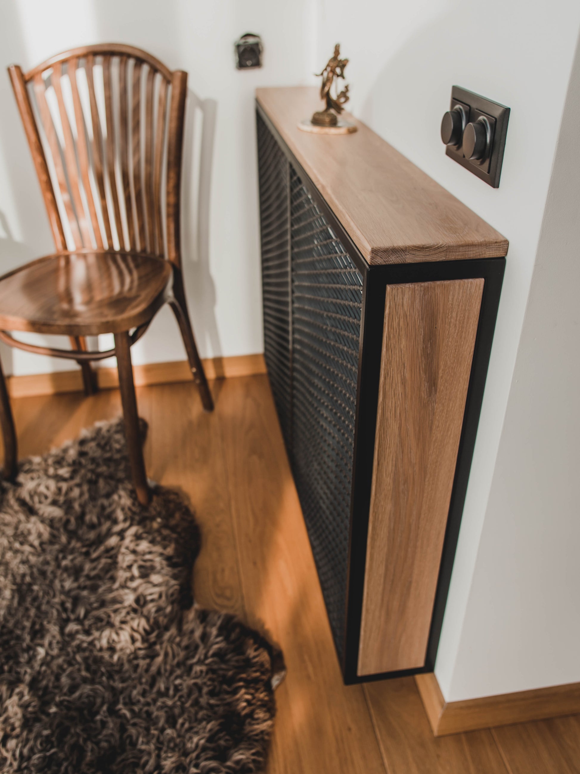 Radiator overlay with a small shelf is an excellent solution that helps to hide an ugly radiator by using metal perforations or mesh, leaving it in the shade and keeping warm air circulating. Concealed and easy mounting allows you to remove the trim if you need access to the radiator.