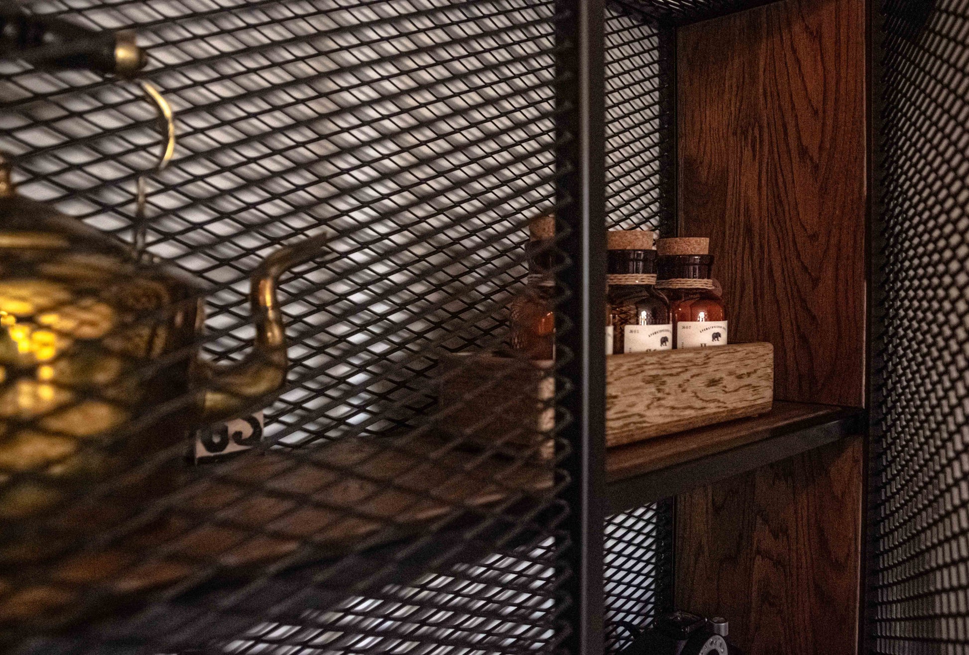 We made the shelves and slats from oak, the wood was treated with natural oil with a hint of tobacco, this color in combination with black elements gives the interior austerity and the mesh emphasizes the loft style. The doors are equipped with long handles and magnets with felt that presses the door quietly and firmly, which gives a pleasant feeling every time you use it.
