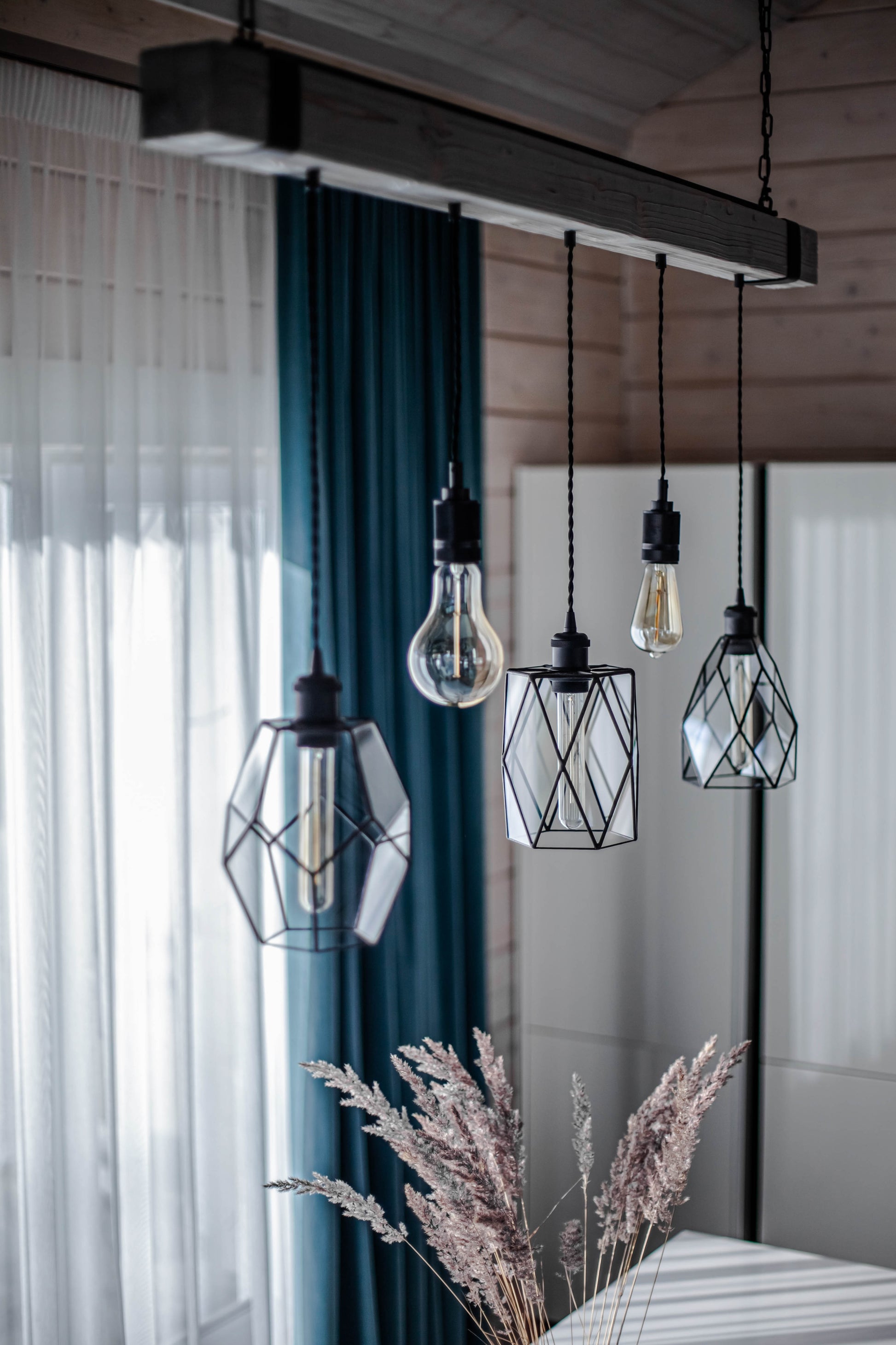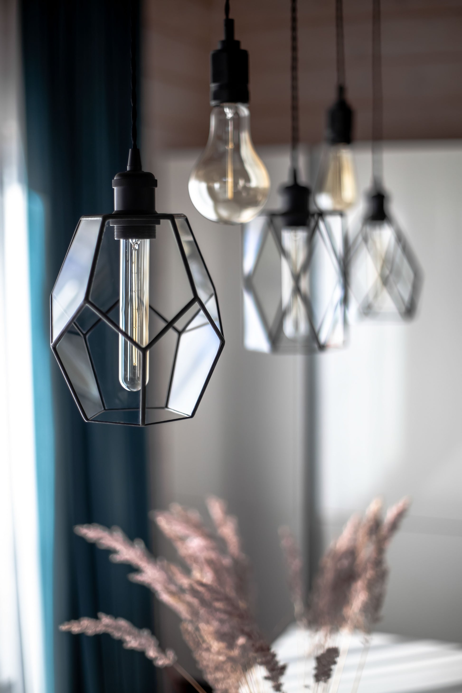 Стеклянные геометрические формы создают световые рефлексы и отблески, днем предмет привносит в комнату атмосферу минимализма и ощущение чистоты, а вечером наполняет пространство теплым светом и отблесками спиралей от светильников - выглядит увлекательно.